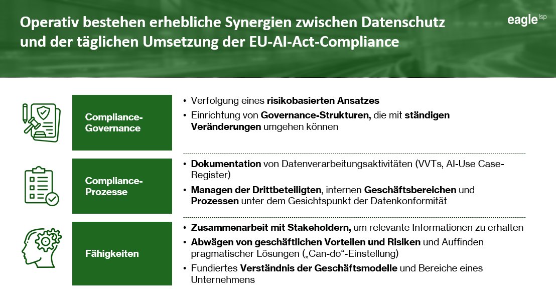 Die schematische Umsetzung ist bei beiden Gesetzen fast deckungsgleich. Egal ob Datenschutz oder AI Act – wir müssen uns in beide Felder hineindenken, um die gleichen Fragen zu beantworten: