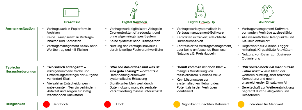 Wichtig: Jede Organisation muss die einzelnen Reifegrade durchlaufen, es gibt keine Short-cuts bzw. Möglichkeiten von Greenfield zum AI-Pionier zu springen. Neben der technischen Komponente müssen alle Stakeholder im Unternehmen die mit Verträgen arbeiten mitgenommen werden.