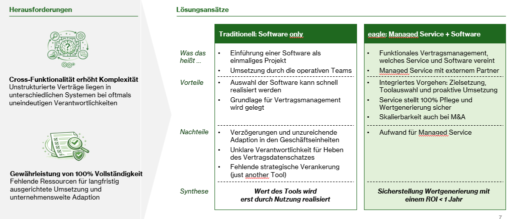 Ein Managed Service Ansatz löst dieses Problem, indem er Service und Software funktional vereint und eine 100%ige Datenpflege garantiert. Durch dieses integrierte Vorgehen – von der Zielsetzung bis zur proaktiven Umsetzung – wird das Vertragsmanagement skalierbar